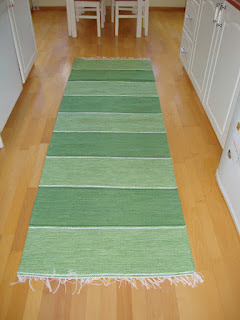 Verhot onkin jo vihreää, mutta ne onkin jo vähän kylläännyttänyt mut, kun on ollu jo useamman vuoden mulla. Muut keittiön verhot taas on ihan eri värisiä. Nyt haluan tuon maton sävyissä... niin no onhan mulla yks pähkähullu idea siihen, mutta ei siitä tällä hetkellä enempää. Sitten eteiseen tuli liila matto.